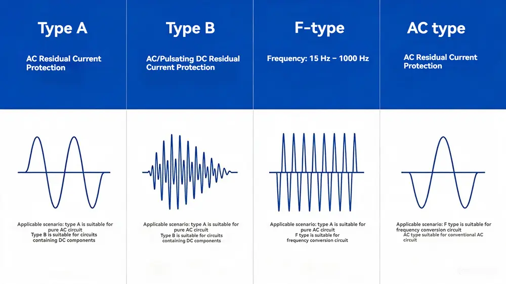 | F/B-Typ | Wechselstrom, pulsierender Gleichstrom und geglätteter Gleichstrom (Typ B); für PV-Anlagen, Ladesäulen & Industrieautomation. | |